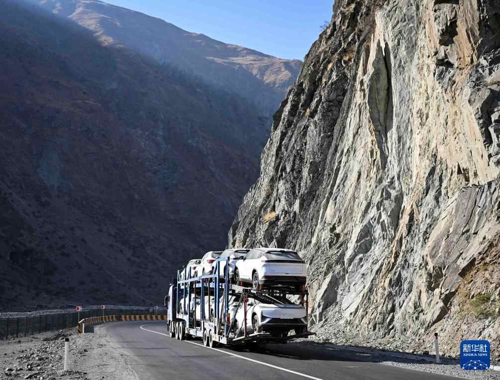 临别之际,一辆载满中国新能源汽车的大车匆匆驶过。