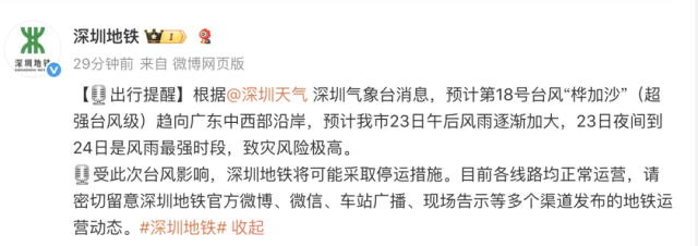 22日晚间,深圳地铁发布公告称,受此次台风影响,深圳地铁将可能采取停运措施。目前各线路均正常运营,请市民密切留意深圳地铁官方微博、微信、车站广播、现场告示等多个渠道发布的地铁运营动态。