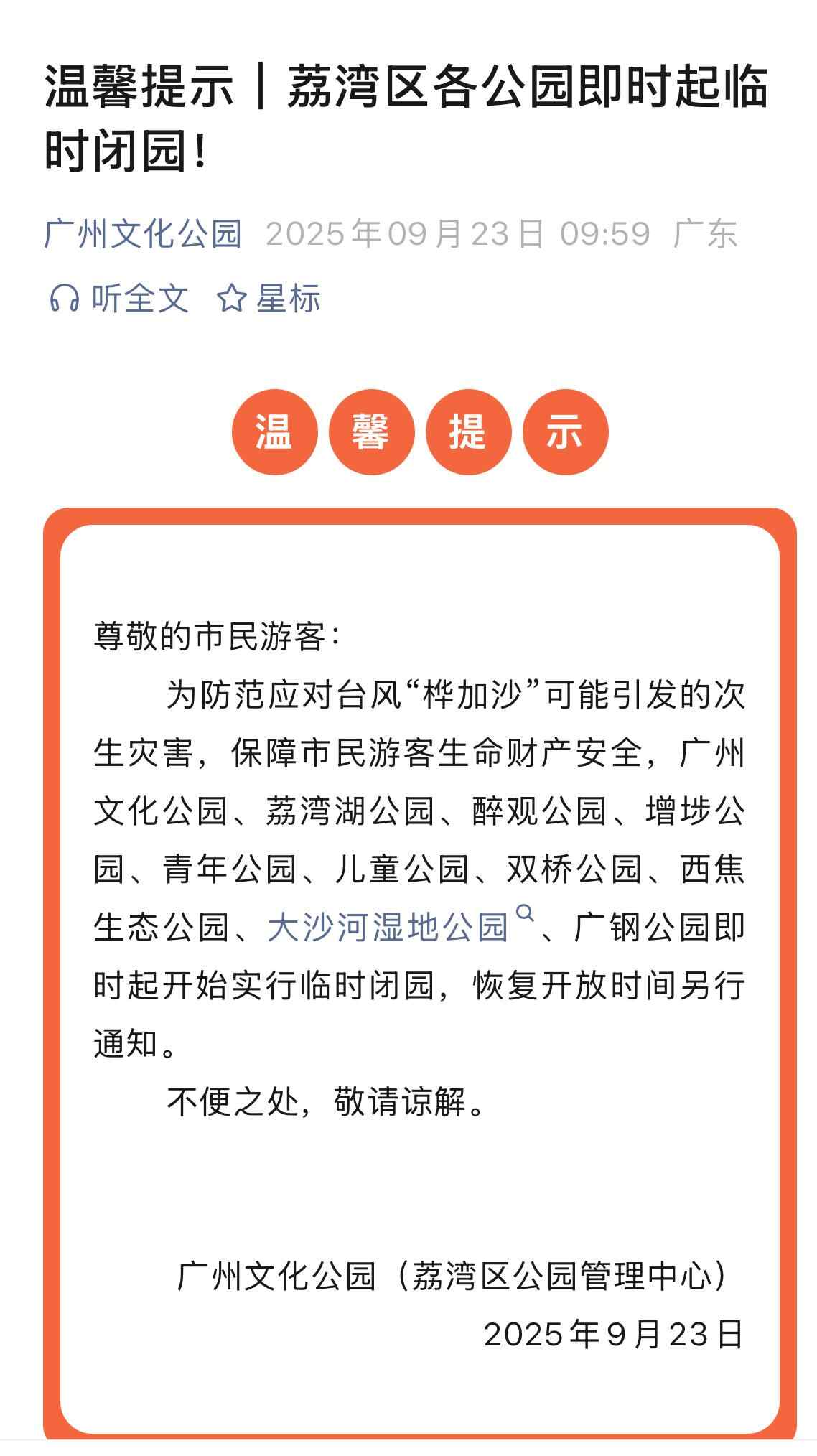9月23日,广州文化公园(荔湾区公园管理中心)通过微信公众号“广州文化公园”发布荔湾区各公园临时闭园通知。