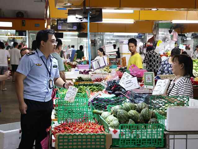 上午九点,凤岗镇农贸市场内人头攒动,市场监管部门的工作人员正穿梭在摊位间开展巡查,重点检查蔬菜、肉类等商品的价格标签,并向商户询问进货渠道和价格情况,提醒经营者要明码标价、合法经营。摊位上瓜果蔬菜、猪肉水产等食品琳琅满目,不少市民正在挑选商品。