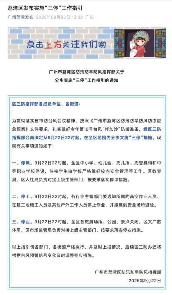 9月22日,广州市荔湾区防汛防旱防风指挥部发布关于分步实施“三停”工作指引的通知。