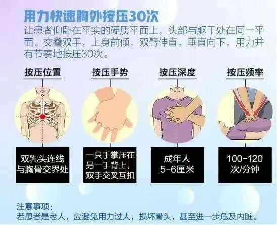 3. 心肺复苏:如果有人具备相应的急救知识,可立即进行心肺复苏。胸外心脏按压的部位:胸骨中下1/3处,按压的深度一般在5-6cm,按压的频率在100-120次/分。