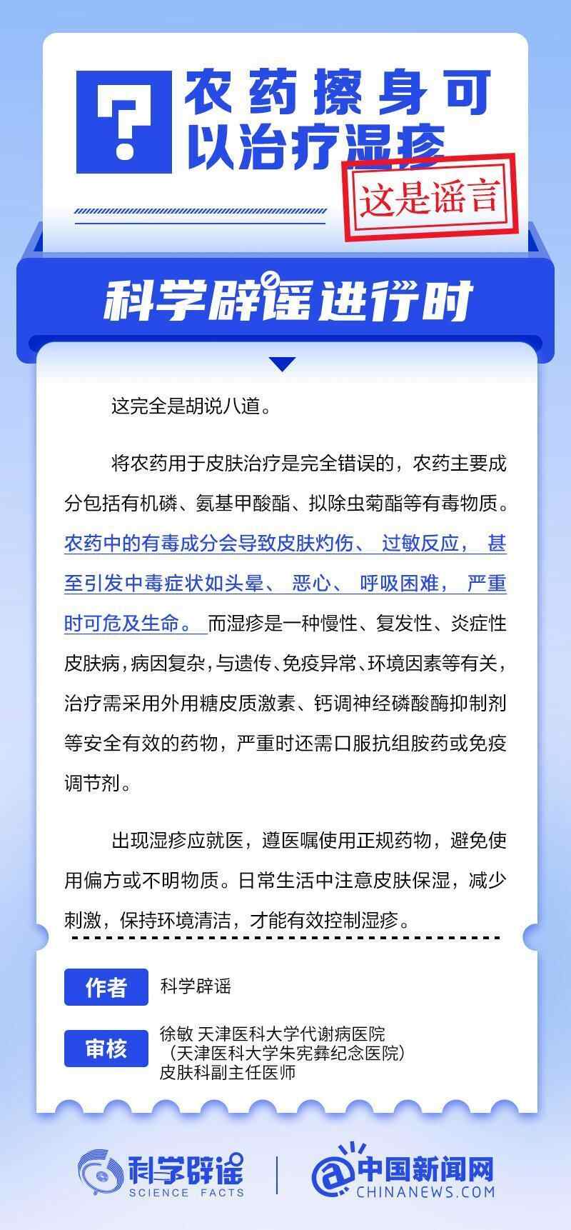 将农药用于皮肤治疗是完全错误的,农药主要成分包括有机磷、氨基甲酸酯、拟除虫菊酯等有毒物质。农药中的有毒成分会导致皮肤灼伤、过敏反应,甚至引发中毒症状如头晕、恶心、呼吸困难,严重时可危及生命。