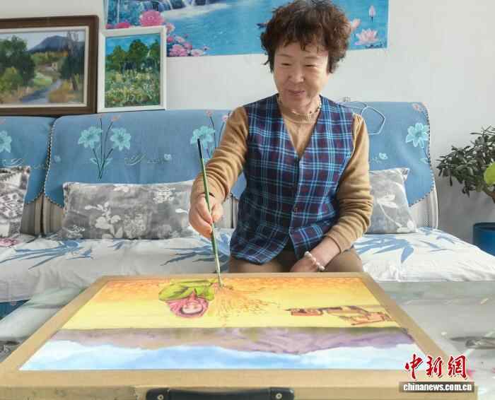 天山脚下,自动收割机在农田中穿梭作业,农妇手握一把麦穗满脸喜悦……这幅名为《丰收》的画作,由新疆吉木萨尔县新地乡小分子村农民画创作者张新香于近期完成。她近日接受中新社采访时表示,希望画出家乡的新面貌,画出越来越好的生活。
