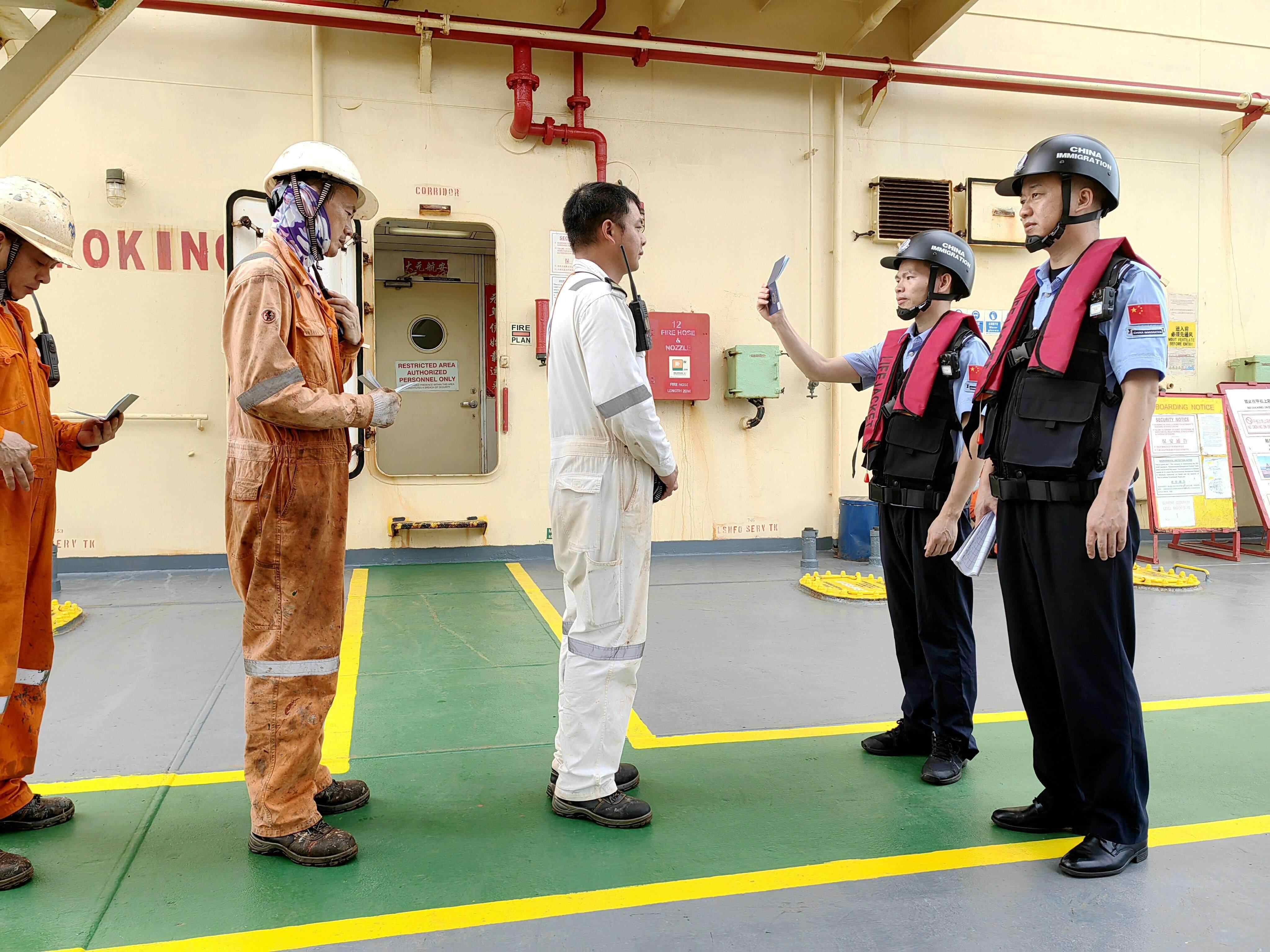 在船舶移泊避风与货物抢卸关键阶段,湛江边检站开通出入境船舶紧急通道。针对需抢卸货物的船舶,主动对接相关单位,高效办理通关手续。9月22日,湛江港调顺岛港区新加坡籍“东方牡丹”轮载运7.7万吨煤炭,在边检民警全程协助下,于台风来临前完成7.54万吨货物抢卸,避免了船舶滞留损失。