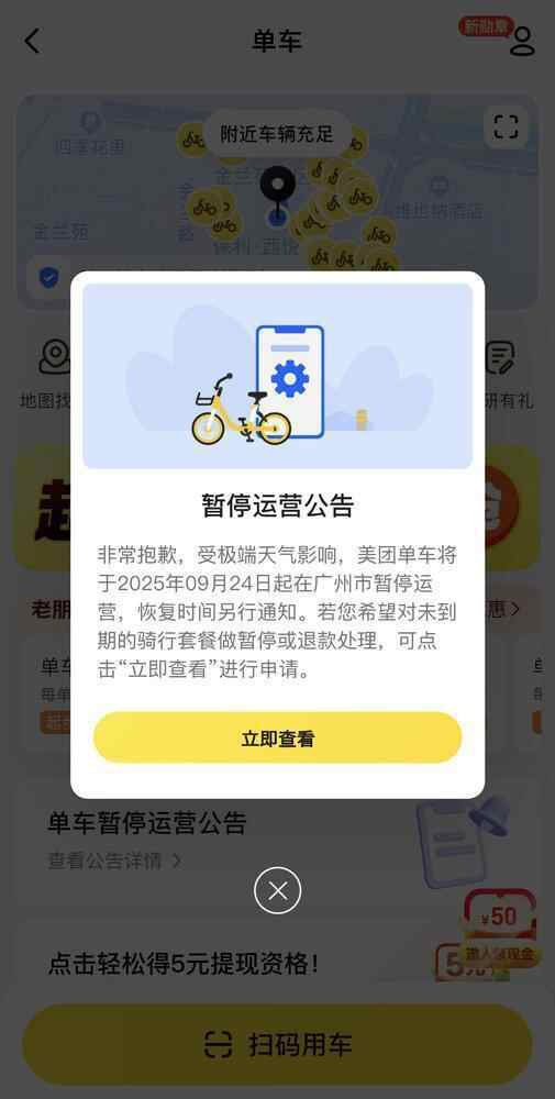 美团单车发布公告,将于9月24日起在广州市暂停运营,恢复时间均另行通知。