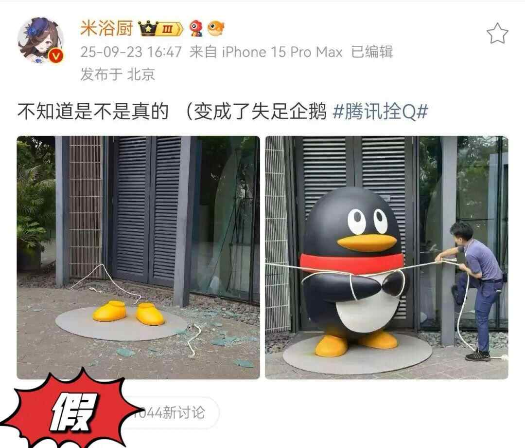 9月23日,腾讯公司为了防御台风,将门口的企鹅用绳拴了起来。而有网民传播的图片显示企鹅只剩双脚,上身被风吹走。腾讯QQ回应:“鹅拴着呢,稳稳的。”