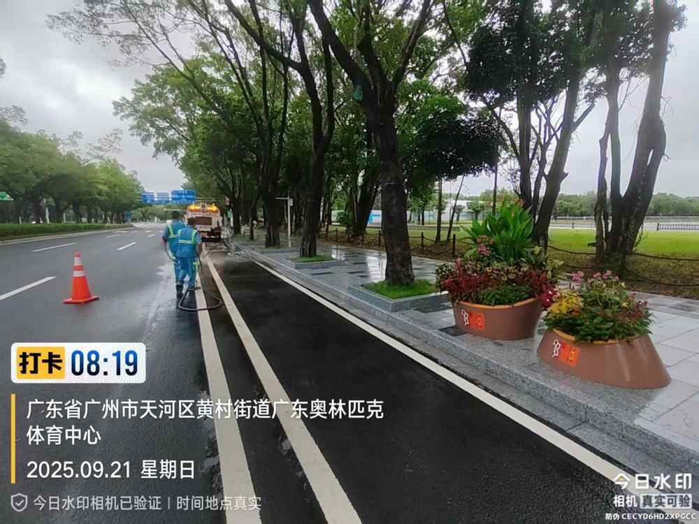 为维护赛事周边整洁环境,天河城管部门在原有60名保洁人员基础上,增派50人加强场馆周边全时段保洁,作业范围覆盖场馆周边约6公里道路及人行道,重点整治绿化带、退缩位等卫生死角。针对台风造成的枯枝落叶散落、暴雨导致的道路泥土污染,工作人员及时清理、冲洗。