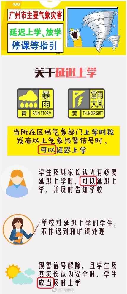 根据《广州市公众应对主要气象灾害指引》和《广州市教育系统应对台风、暴雨灾害天气指引》,当所在区域发布台风黄色及以上级别预警信号时,学校应当停课。此外,不同级别的暴雨、雷雨大风预警信号也与延迟上学、停课安排相关,广大市民需密切留意。