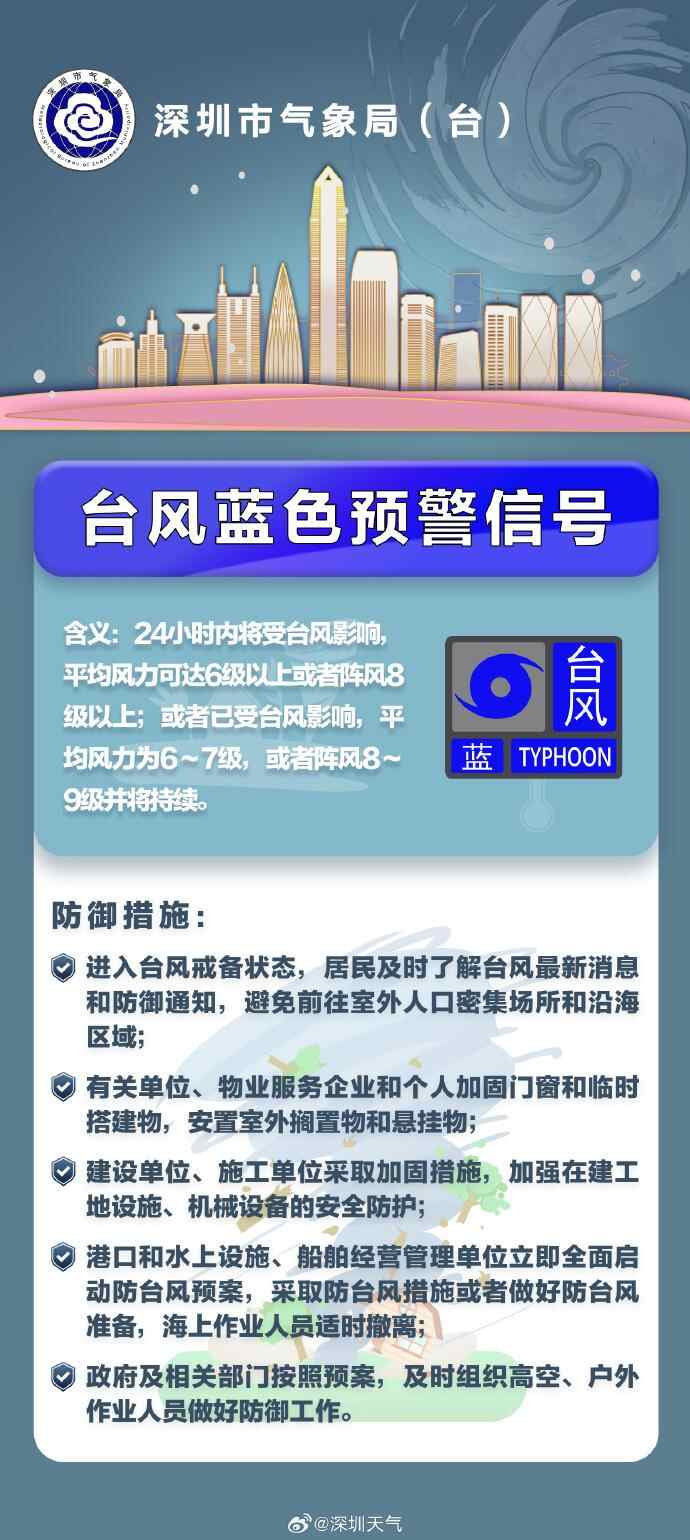 台风蓝色预警信号:24小时内将受台风影响,平均风力可达6级以上,或者阵风8级以上;或者已经受台风影响,平均风力为6~7级,或者阵风8~9级并将持续。