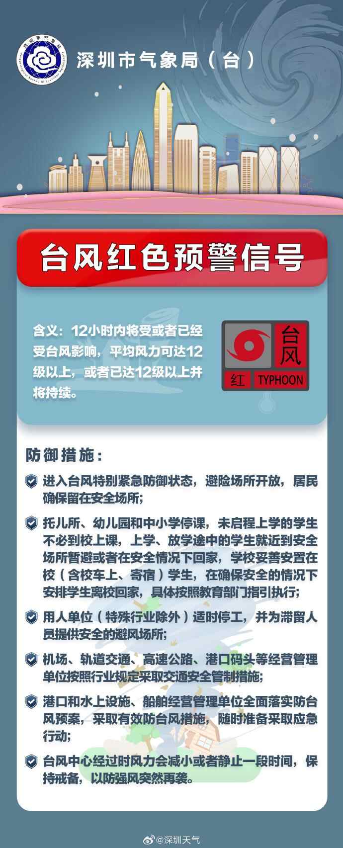台风红色预警信号:12小时内将受或者已经受台风影响,平均风力可达12级以上,或者已达12级以上并将持续。