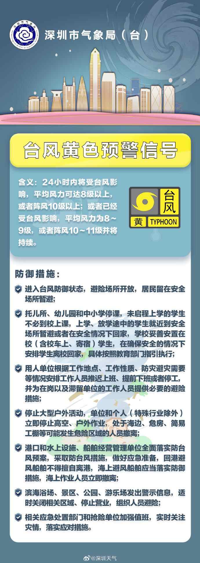 台风黄色预警信号:24小时内将受台风影响,平均风力可达8级以上,或者阵风10级以上;或者已经受台风影响,平均风力为8~9级,或者阵风10~11级并将持续。