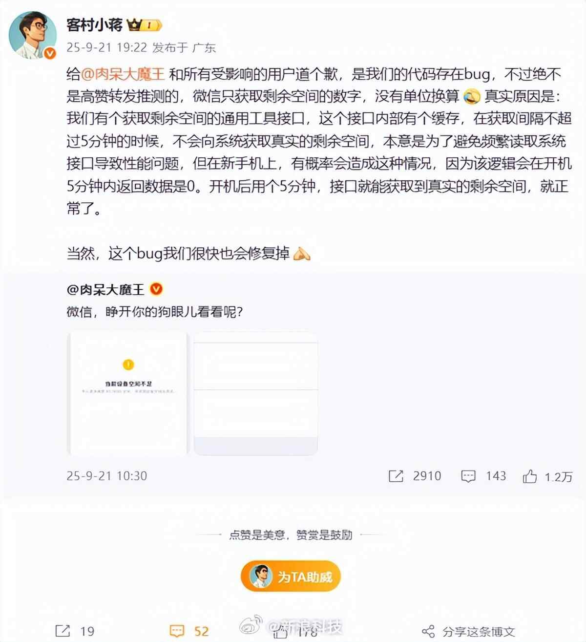 对此,微信员工“客村小蒋”发文称,微信的代码存在Bug,将很快修复。