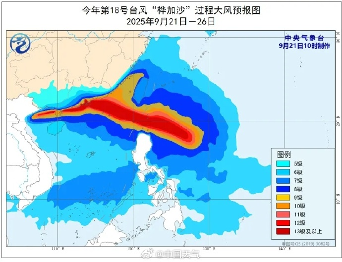 预计23日至26日,广东大部、广西中南部、福建南部、江西南部、湖南南部、云南东部、海南岛等地有大到暴雨,部分地区有大暴雨,局地特大暴雨。巴士海峡、台湾海峡、南海北部、琼州海峡、北部湾等海域及华南沿海将先后有10~11级大风,台风中心经过的附近海域或地区有14~17级大风,阵风17级以上。