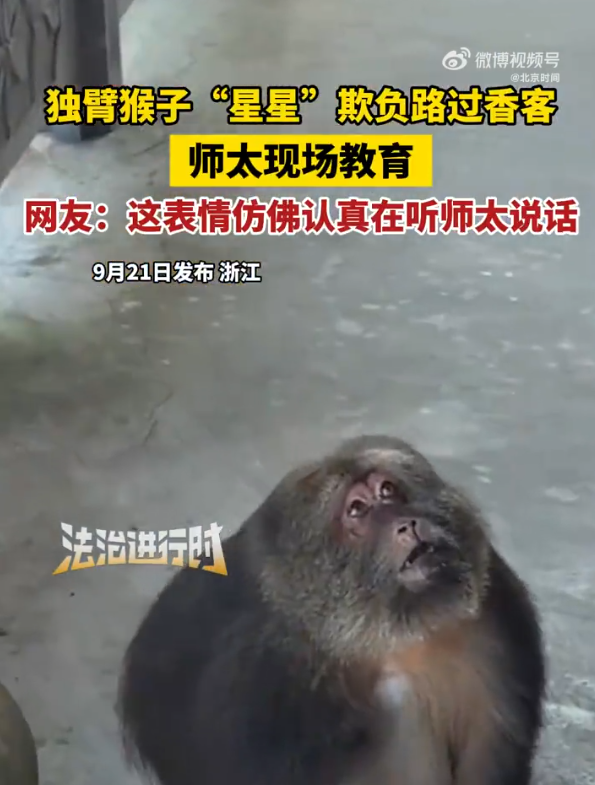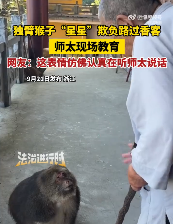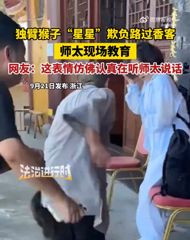 近日,浙江宁波,独臂猴星星欺负路过香客,师太现场教育。