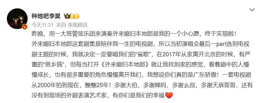9月22日中午,李昊在个人社交账号@种地吧李昊 上发文表示:“用一大班管弦乐团来演奏外来媳妇本地郎是我的一个小心愿,终于实现啦!”他说,2017年离家到北京的时候,有严重的“思乡病”,但每当打开《外来媳妇本地郎》就能找到家的感觉,“看着剧中的人慢慢成长,也有很多重要的角色慢慢离开我们,我想说你们真的是广东骄傲!”