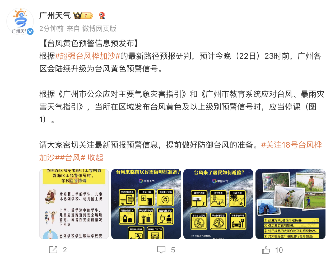 广州市气象台9月22日夜间表示,根据超强台风“桦加沙”的最新路径预报研判,预计9月22日23时前,广州各区会陆续升级为台风黄色预警信号。根据《广州市公众应对主要气象灾害指引》和《广州市教育系统应对台风、暴雨灾害天气指引》,当所在区域发布台风黄色及以上级别预警信号时,应当停课。