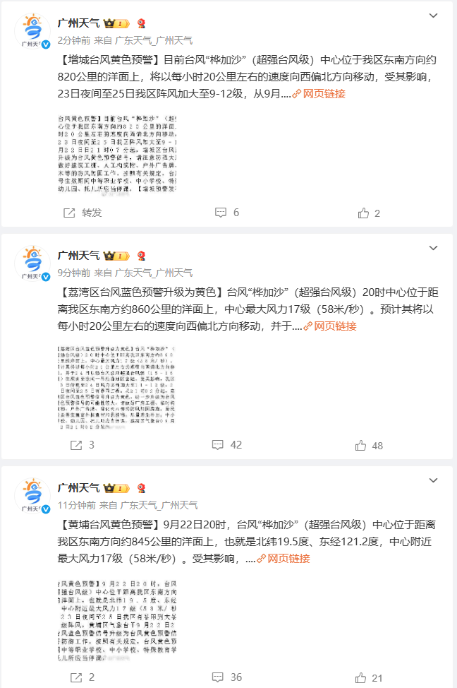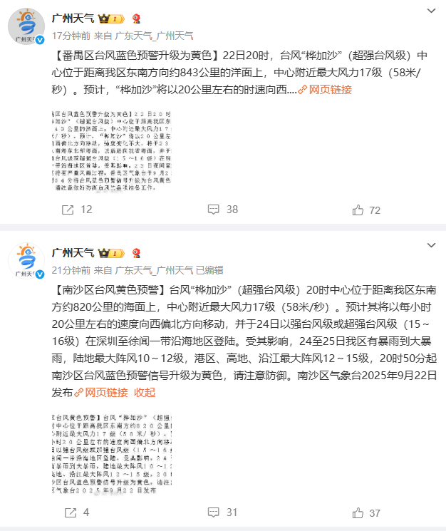 据悉,除了越秀、天河两区外,广州各区也将陆续升级台风黄色预警信号,截至21时20分,南沙区、番禺区、黄埔区、荔湾区、增城区、海珠区都已发布台风黄色预警信号。