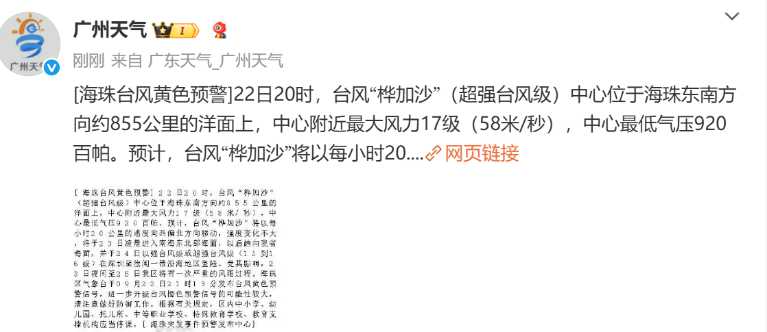 广州市气象台9月22日表示,目前台风“桦加沙”(超强台风级)中心位于广州东南方向约840公里的洋面上,将以每小时20公里的速度向西偏北方向移动,受其影响,预计23日起陆地阵风加大至9~13级,港区和高地阵风加大至13~17级,并伴有一次暴雨到大暴雨的降水过程。从9月22日20时58分起,越秀区、天河区台风黄色预警信号生效,上述两区进一步升级为台风橙色预警信号的可能性较大。