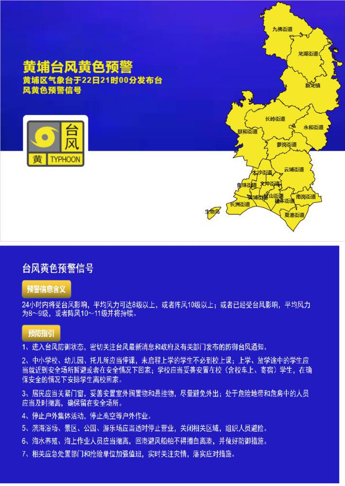 9月22日21时,羊城晚报记者获悉,广州市黄埔区气象台发布黄埔台风黄色预警。21时10分,黄埔区教育局、区气象局联合发布23-24日停课通知。