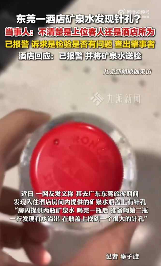 近日,一网友在社交平台发文称,其去广东东莞旅游期间,发现入住酒店房间内提供的矿泉水瓶盖上有针孔,引发关注。该网友称,酒店房间共提供了两瓶矿泉水,喝完一瓶后准备喝第二瓶,用手一拧发现有水溢出来,仔细一看发现瓶盖上有个很大的针孔。该网友当即报警处理并将证据固定。