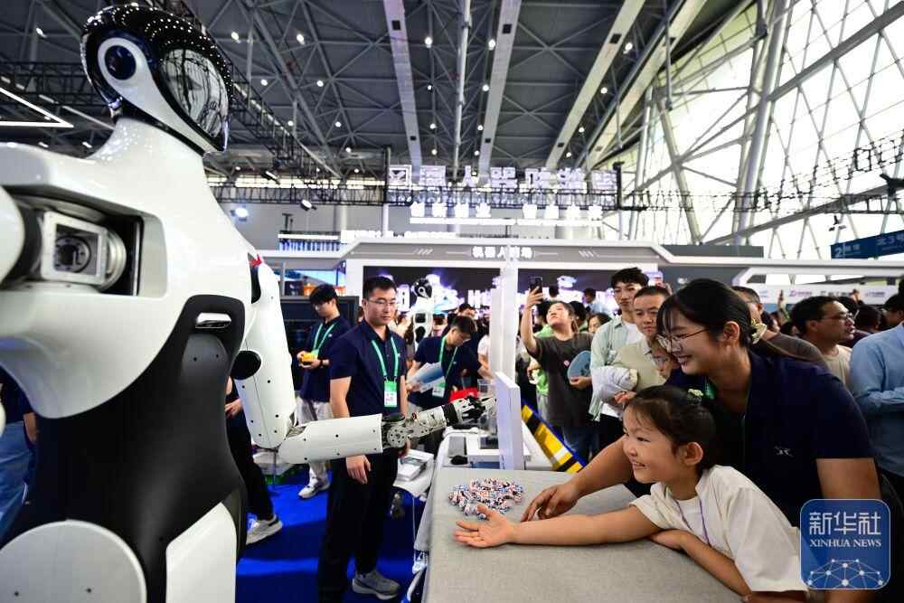 ↑ 9月20日,小朋友在2025世界制造业大会上和一款人形机器人互动。新华社记者 周牧 摄