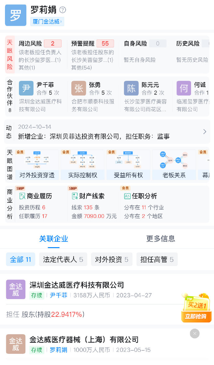 王永贵提到,罗莉娟资产颇丰,在长沙的两家美容机构资产上千万元,除此之外,她名下还有十多家公司,其中包括深圳的一家医疗器械公司。“不存在跑路,她一直没有拖欠过一分钱工资,她的员工反馈她是一个很好的人,一部分员工想留下继续经营。她本身资产比较雄厚,她也没有干违法的事。而且她性格阳光开朗,在我们行业声誉非常好。我记得7月份还给我们提出,说想把事业做大,以后有没有机会升为副会长。”