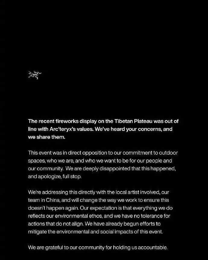 记者注意到,始祖鸟海外社媒也发了英文致歉信,不过内容与国内版本有差异。海外版称对青藏高原烟花表演深感遗憾,此行为与品牌环保价值观及期望不符,郑重致歉。同时,还提到“正与相关艺术家和中国团队沟通,调整工作方式避免类似情况”。