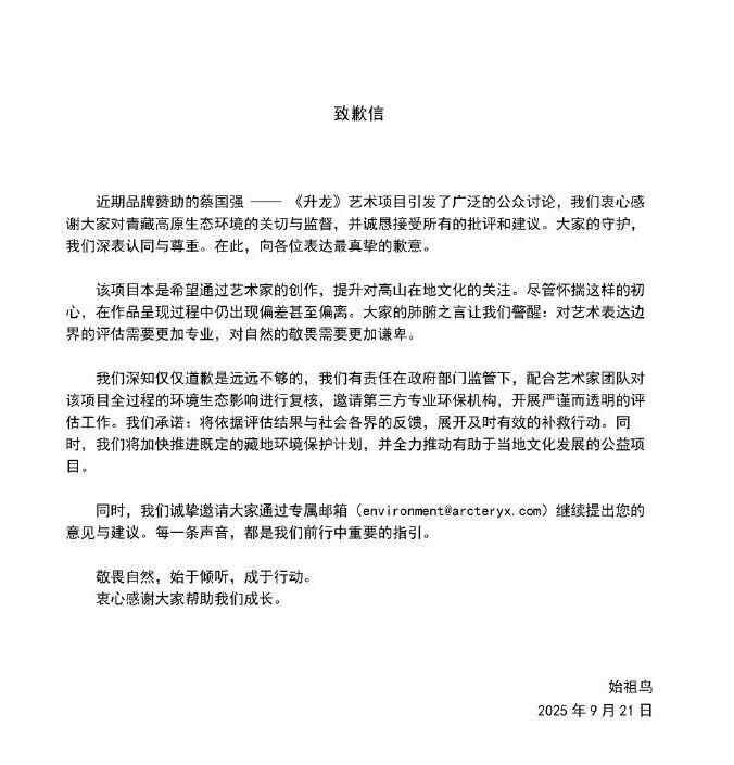 9月21日,始祖鸟在国内社媒平台致歉,称对艺术表达边界评估要更专业、对自然要更谦卑,承诺在政府监管下,配合团队复核项目生态影响,邀第三方评估并依结果补救,同时推进藏地环保计划与文化公益项目。蔡国强工作室同日说明,虚心接受批评,将配合评估,如有影响会尽力补救。