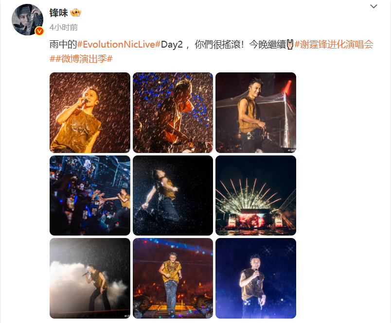 在谢霆锋的个人社交账号,也发布了多张本人雨中表演的现场照片。