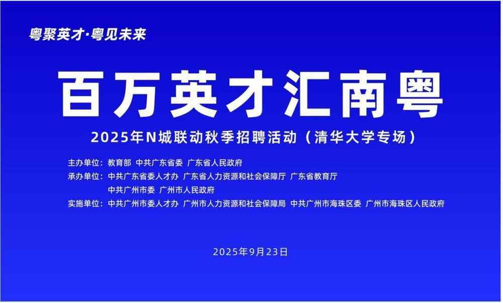 记者9月21日从广州市海珠区获悉,为搭建高校学子与优质用人单位的对接桥梁,助力优秀人才扎根粤港澳大湾区发展,“百万英才汇南粤”2025年N城联动秋季招聘活动(清华大学专场)将于9月23日(星期二)上午,在清华大学祖龙广场、华为多功能厅开展。活动由教育部、中共广东省委、广东省人民政府主办,中共广东省委人才办、广东省人力资源和社会保障厅、广东省教育厅、中共广州市委、广州市人民政府承办,中共广州市委人才办、广州市人力资源和社会保障局、中共广州市海珠区委、广州市海珠区人民政府实施。