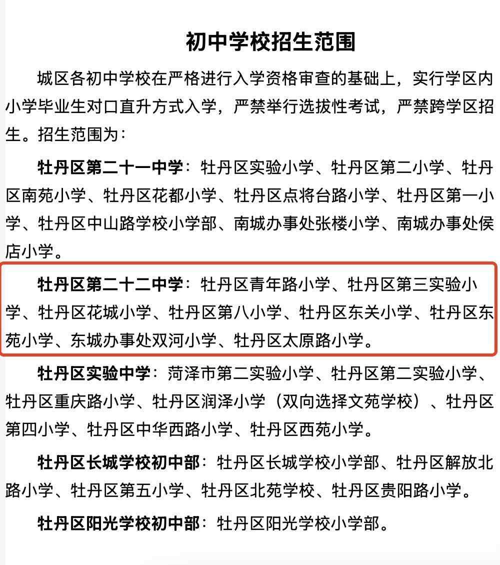 22中于2024年8月10日、2025年8月9日发布在公众号的招生公告显示,招生对象包含12所小学。牡丹区教体局官网显示,今年8月11日牡丹区教体局公布的招生范围中,22中对口的仅有8所小学。