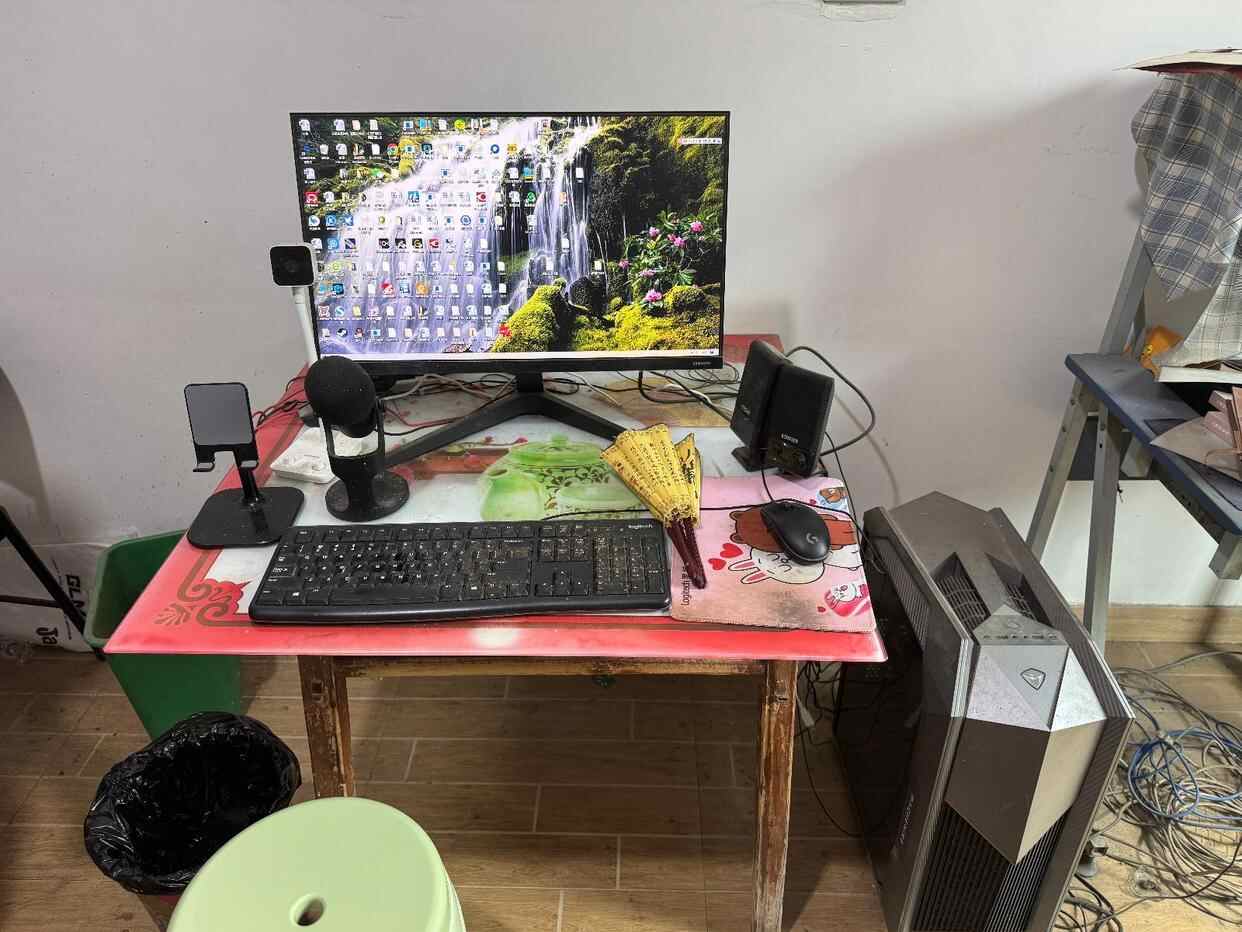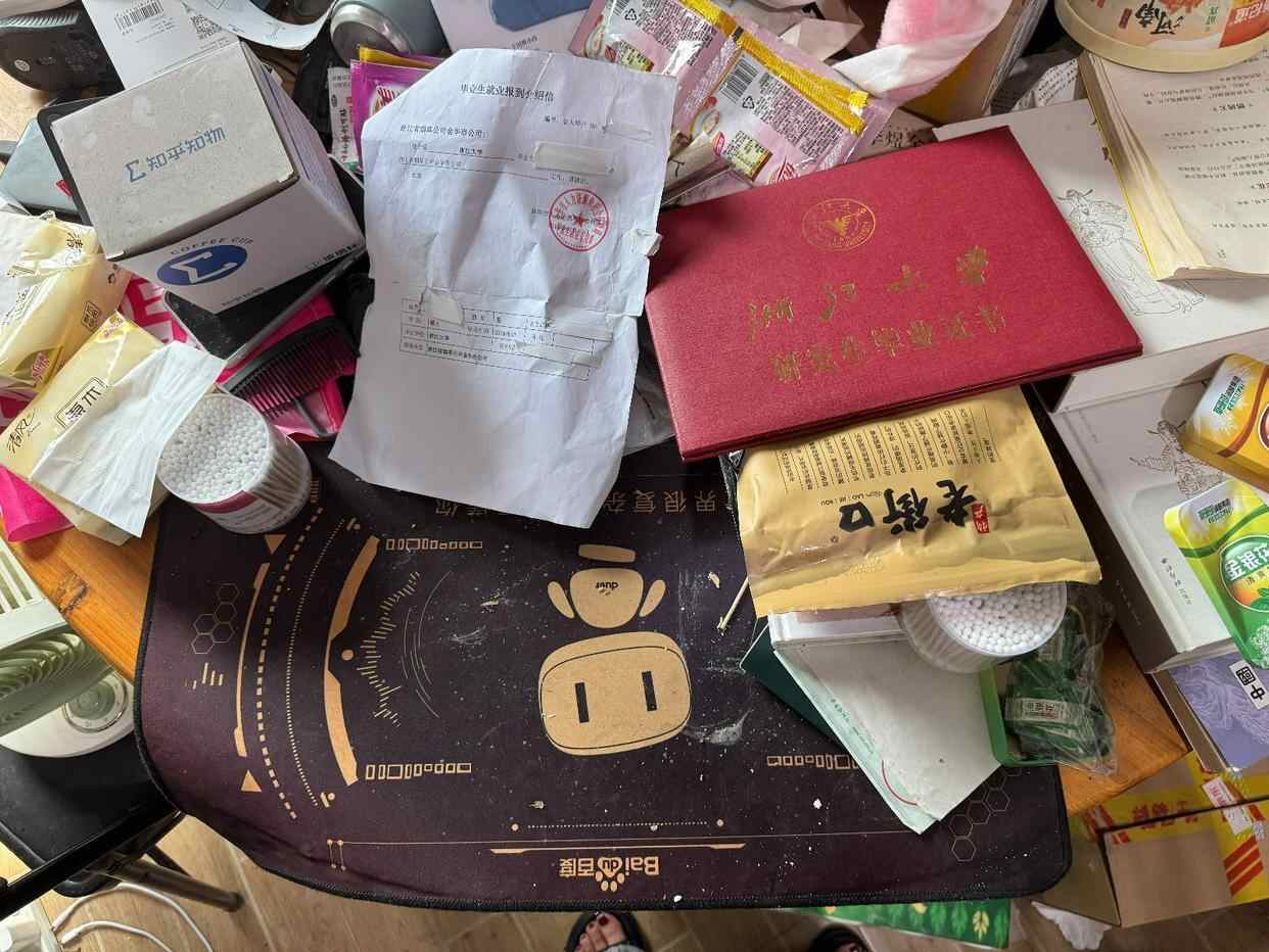 他和父母住在一起,十几平方米的房间堆得满满当当,进门的右手边地上堆满了书,书上落满灰尘,书堆前有两个大圆桌,桌上堆着旧书、杂物,还有他的浙江大学硕士毕业证书、做自媒体博主时大厂寄来的礼物。靠窗的位置放着两张电脑桌,一个落满了厚厚一层灰,另一个是农村常见的四角桌,桌子已有些脱漆,桌上放着电脑显示屏、键盘鼠标、手机支架、音响还有直播用的设备。