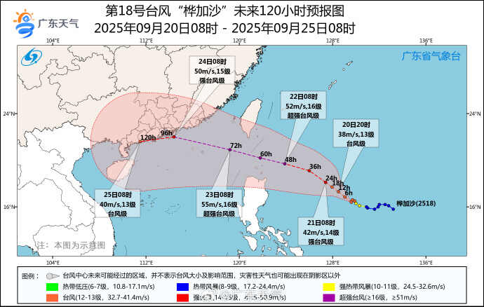 根据广东省气象台9月20日8时发布的“桦加沙”未来120小时预报图,“桦加沙”将在9月23日前后,以超强台风强度穿越巴士海峡进入南海,并在24日至25日以强台风至台风级强度靠近或登陆广东沿海地区。