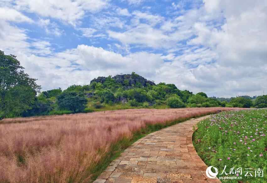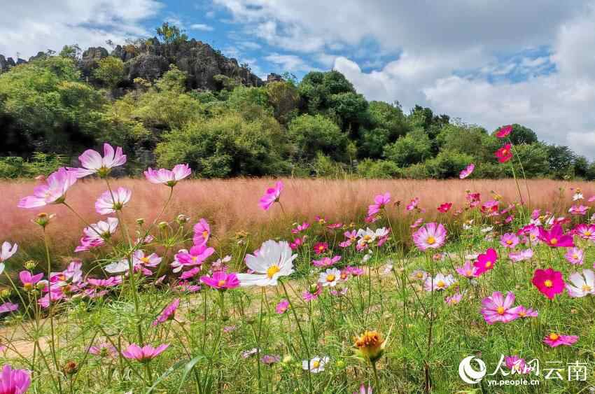 人民网昆明9月19日电 秋日的云南乃古石林风景区,大片波斯菊盛放。沿着石板小路向深处走去,路旁连片的粉黛乱子草随风摇曳,宛如轻柔的粉色云雾,悄然飘落人间。红的明艳、粉的娇嫩、白的素雅,和历经2.7亿年岁月雕琢的灰黑色石头丛林相映成趣,尽显秋日独有的浪漫。(尹馨、刘莎)