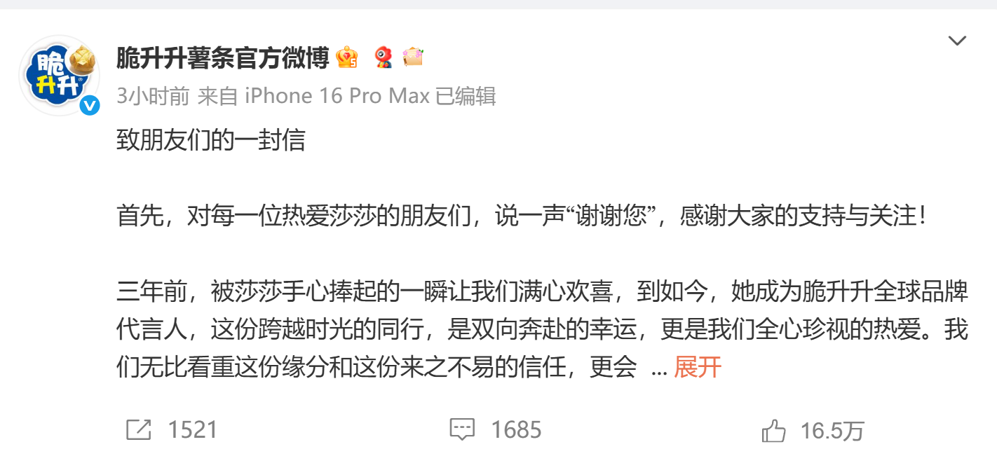 三年前,被莎莎手心捧起的一瞬让我们满心欢喜,到如今,她成为脆升升全球品牌代言人,这份跨越时光的同行,是双向奔赴的幸运,更是我们全心珍视的热爱。我们无比看重这份缘分和这份来之不易的信任,更会用最严谨的态度守护她的形象。