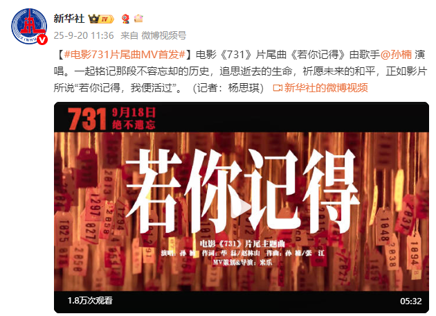 电影《731》片尾曲《若你记得》由歌手@孙楠 演唱。一起铭记那段不容忘却的历史,追思逝去的生命,祈愿未来的和平,正如影片所说“若你记得,我便活过”。