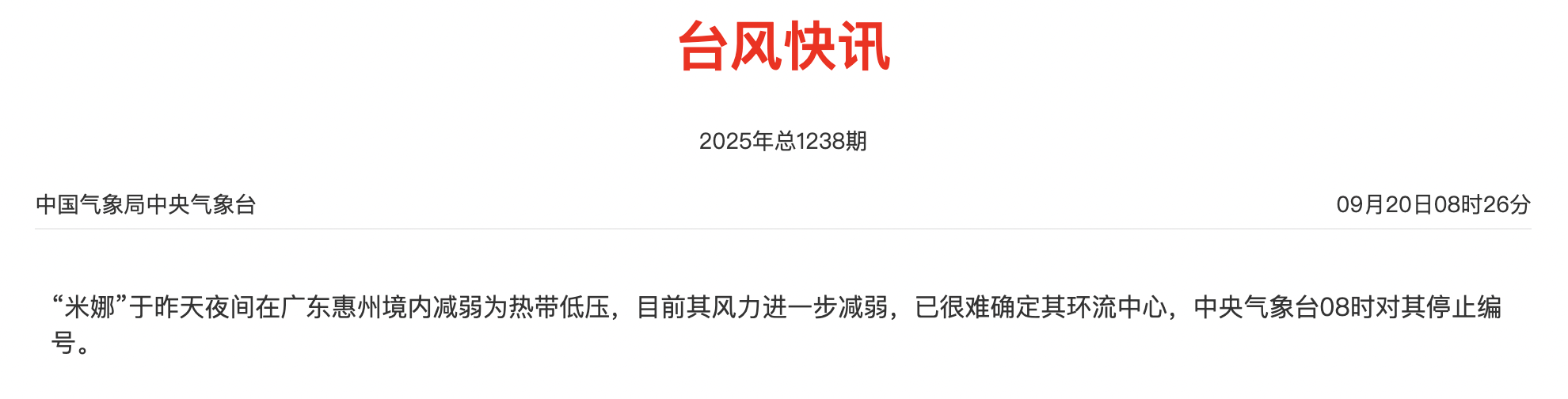 根据中央气象台观测,今年第17号台风“米娜”减弱后的热带低压,截至9月20日5时中心位于广东省惠州市境内。由于“米娜”风力进一步减弱,已很难确定其环流中心,中央气象台已在9月20日8时对其停止编号。