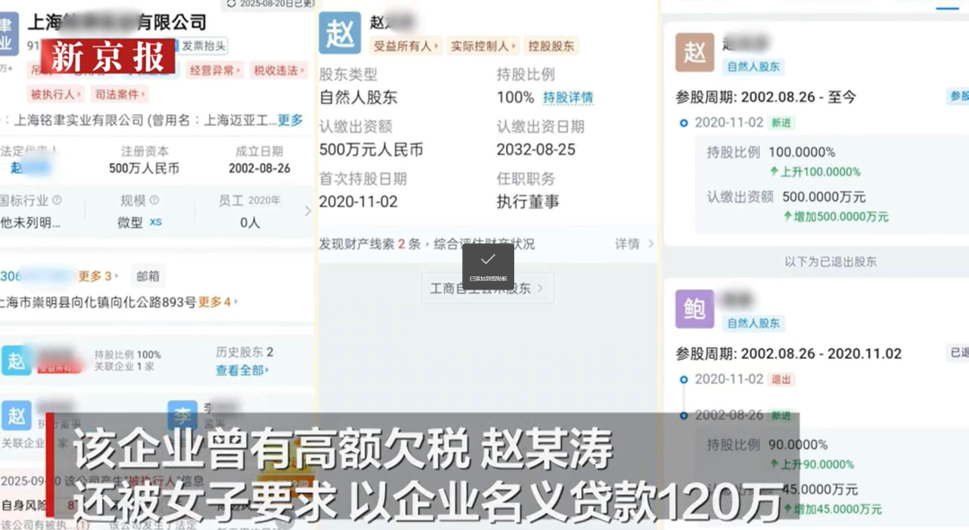 该企业曾有高额欠税。赵某涛还被女子要求以企业名义贷款120万。