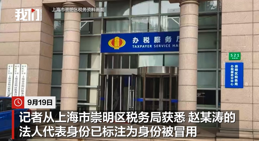 9月19日,记者从上海崇明区税务局获悉,赵某涛法人代表身份已被标注为冒用。