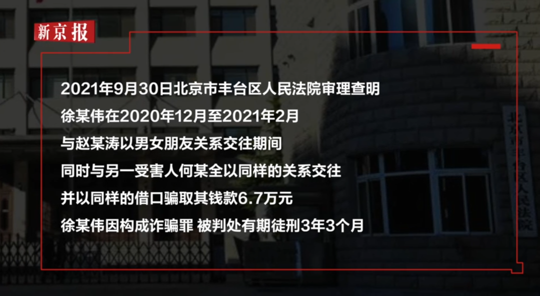 2021年9月30日,北京市丰台区人民法院审理查明,徐某伟在2020年12月至2021年2月与赵某涛以男女朋友关系交往期间,同时与另一受害人何某全以同样的关系交往,并以同样的借口骗取其钱款6.7万元。徐某伟因构成诈骗罪,被判处有期徒刑3年3个月。