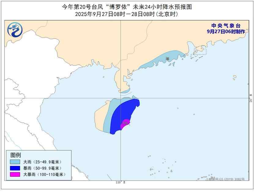 降水预报:27日08时至28日08时,海南岛中东部、雷州半岛南部、广东中西部沿海等地的部分地区有大到暴雨,其中海南岛东南部局地大暴雨(100-110毫米)。