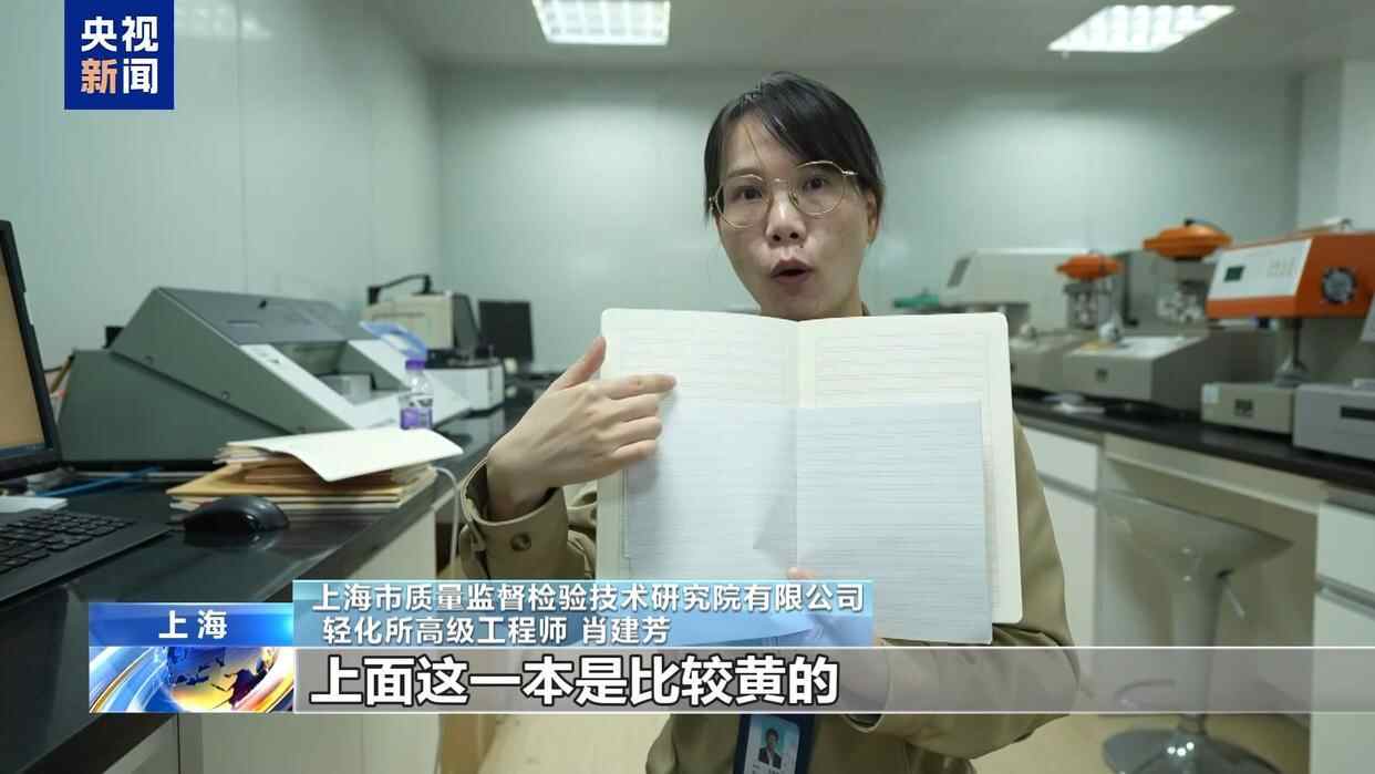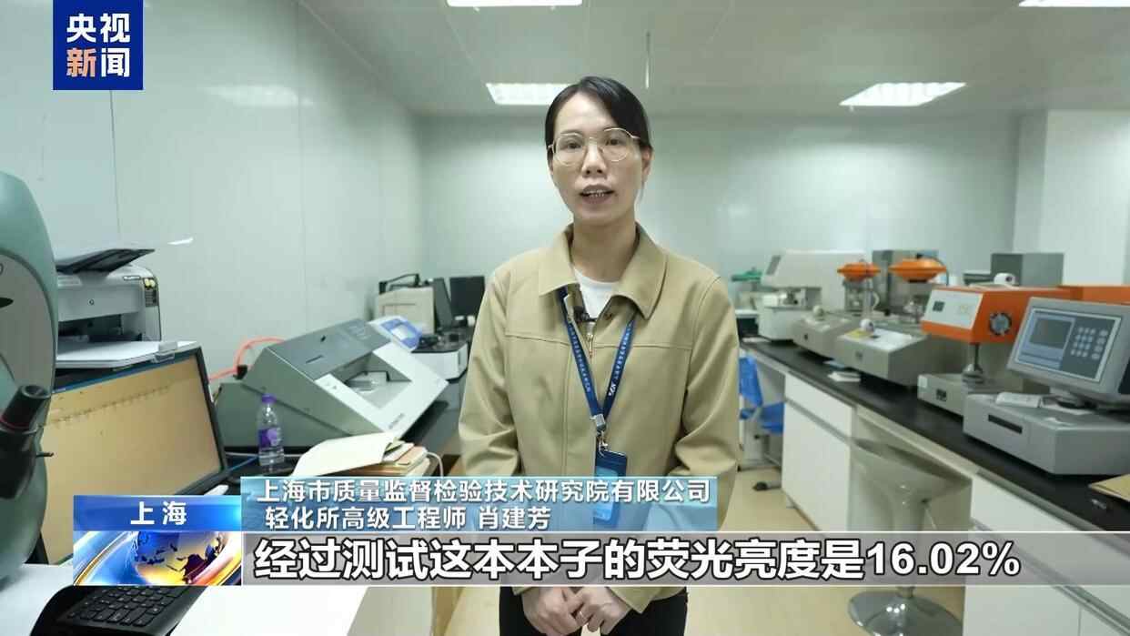 上海市质量监督检验技术研究院有限公司轻化所高级工程师 肖建芳:经过测试,这个本子的荧光亮度是16.02%,远远高出了国家标准5.0的限量值要求。