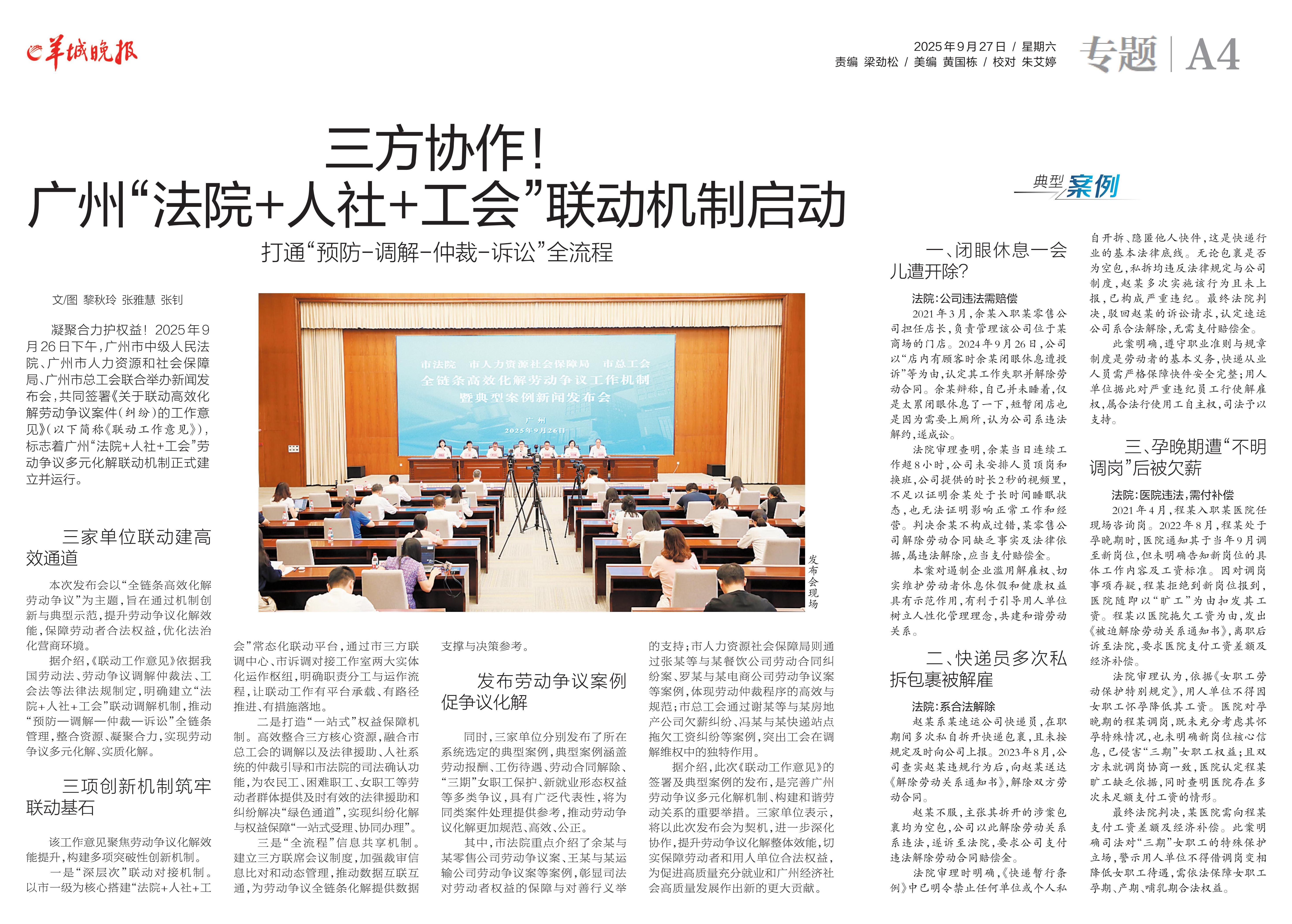 凝聚合力护权益!9月26日下午,广州市中级人民法院、广州市人力资源和社会保障局、广州市总工会联合举办新闻发布会,共同签署《关于联动高效化解劳动争议案件(纠纷)的工作意见》(以下简称《联动工作意见》),标志着广州“法院+人社+工会”劳动争议多元化解联动机制正式建立并运行。