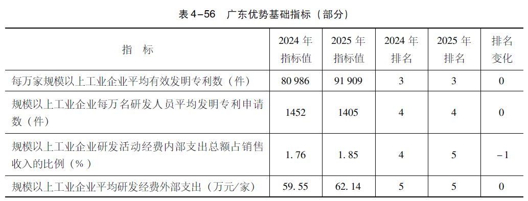 具体来看,广东在企业创新方面有以下几个优势基础指标:每万家规模以上工业企业平均有效发明专利数排名与上年持平,排第3位;规模以上工业企业每万名研发人员平均发明专利申请数排名与上年持平,排第4位;规模以上工业企业研发活动经费内部支出总额占销售收入的比例排名较上年下降1位,排第5位;规模以上工业企业平均研发经费外部支出排名与上年持平,排第5位。
