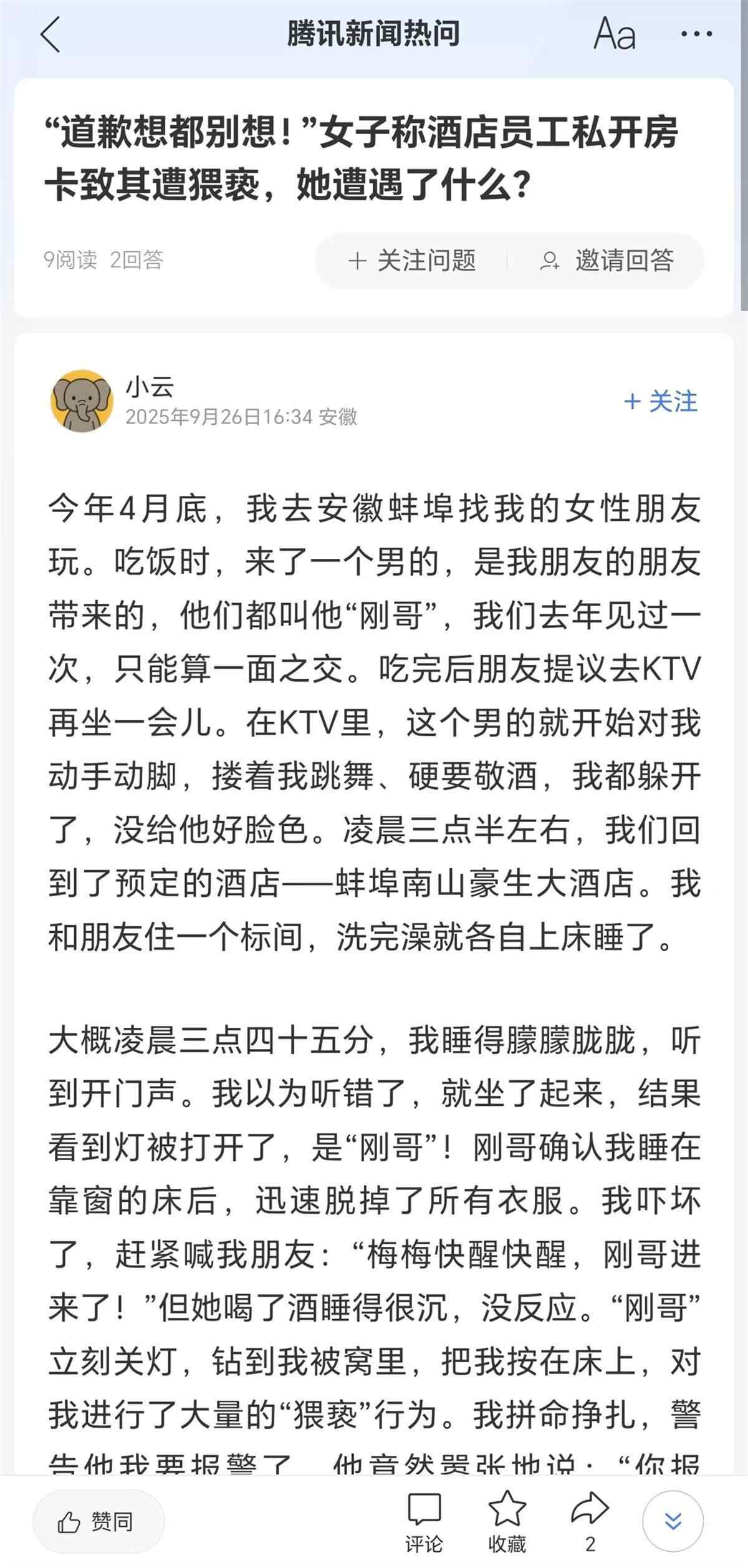 9月26日,安徽网友“小云”在腾讯新闻“热问”发声,称在今年4月和闺蜜入住蚌埠南山豪生大酒店时,一名男子从前台获取房卡后进入房间强制猥亵了她。27日,涉事酒店工作人员表示,酒店方一直在处理此事。