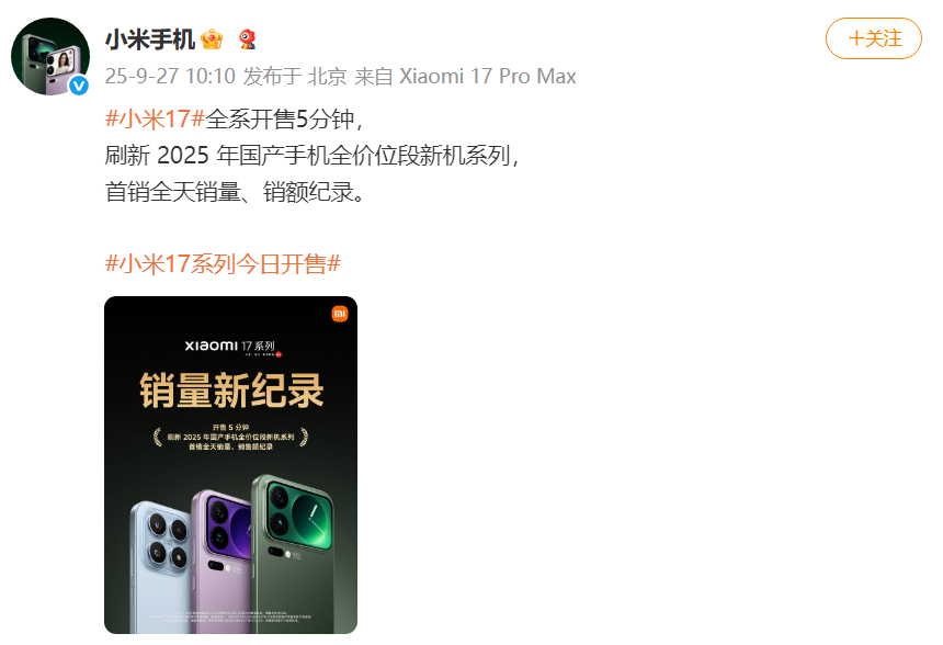 9月27日10点,小米17系列全渠道开售。据@小米手机 官方微博消息,全系开售5分钟,刷新2025年国产手机全价位段新机系列,首销全天销量、销额纪录。