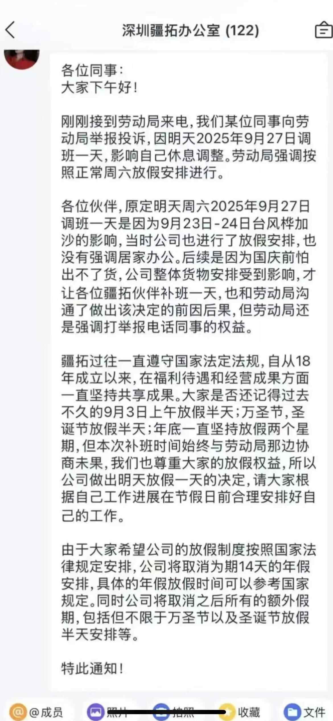 发布通知的是深圳市疆拓商贸有限公司(以下简称“深圳疆拓”)。深圳疆拓发布的通知称,公司原定于2025年9月27日(周六)调班一天,以弥补此前因台风“桦加沙”影响导致的放假安排。9月23日至24日,受台风“桦加沙”影响,公司曾安排放假,且未要求居家办公。然而,随着国庆假期临近,公司为确保货物及时发出,决定让员工27日补班一天。