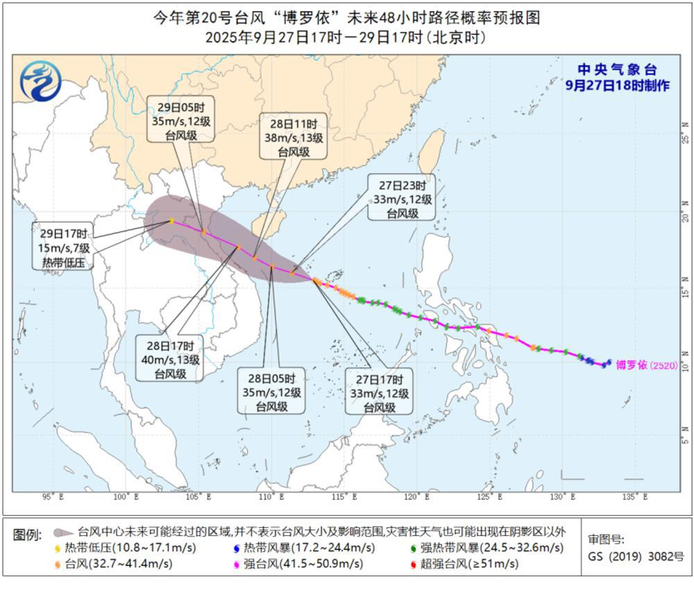 根据中央气象台监测,“博罗依”的中心9月27日17时位于海南省三沙市(西沙永兴岛)东南方约160公里的南海中部海面上,中心附近最大风力有12级(33米/秒),达到台风级强度。预计 “博罗依”将以35公里左右的时速向西偏北方向移动,趋向海南岛南部海面,最强可达台风级(13级左右),将于28日傍晚到夜间在越南中北部沿海登陆。
