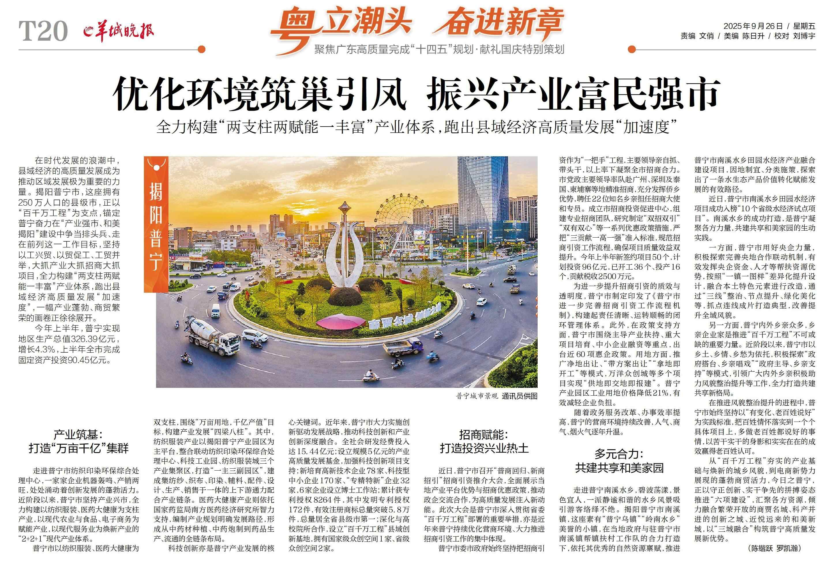 从“百千万工程”夯实的产业基础与焕新的城乡风貌,到电商新势力展现的蓬勃商贸活力,今日之普宁,正以守正创新、实干争先的拼搏姿态推进“六项建设”,汇聚各方资源,倾力融合繁荣开放的商贾名城、科产并进的创新之城、近悦远来的和美新城,以“三城融合”构筑普宁高质量发展新优势。